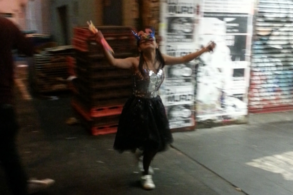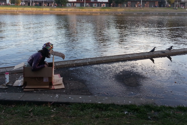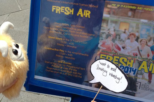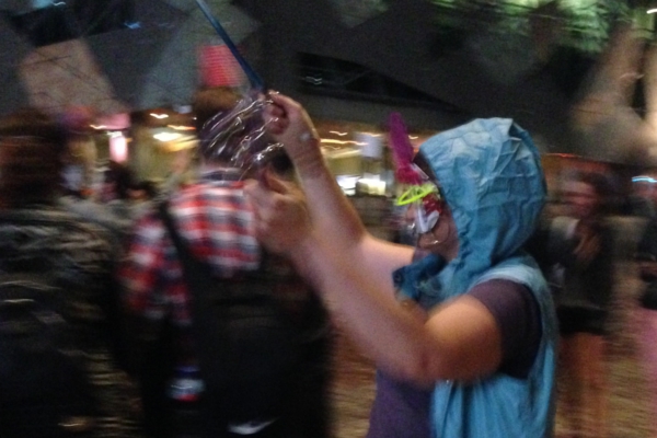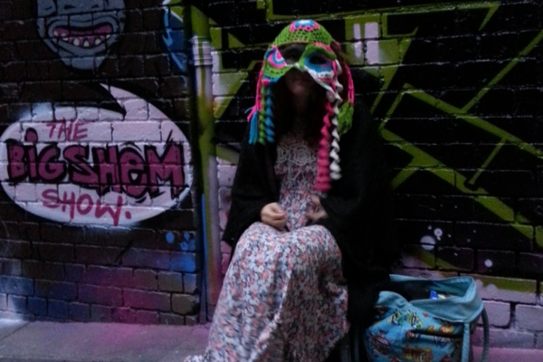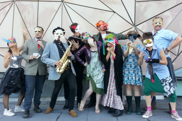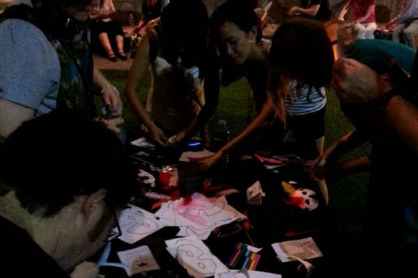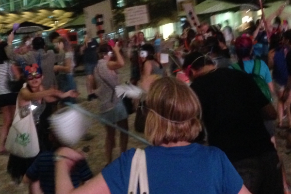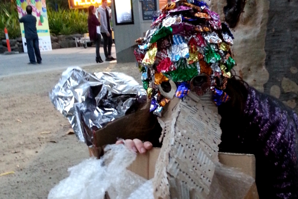 Spirits Walk was a headline game for Fresh Air 14, a festival of games and play in Melbourne. Developed in collaboration with festival organisers Pop Up Playground, Spirits Walk invited players to step into a hidden world of strange spirits, sundry otherlings and dimensional curiosities, and there to shed their inhibitions, play with the spirits they discovered and eventually don a mask of their own making for a grand parade. All photos are courtesy of Pop Up Playground.
